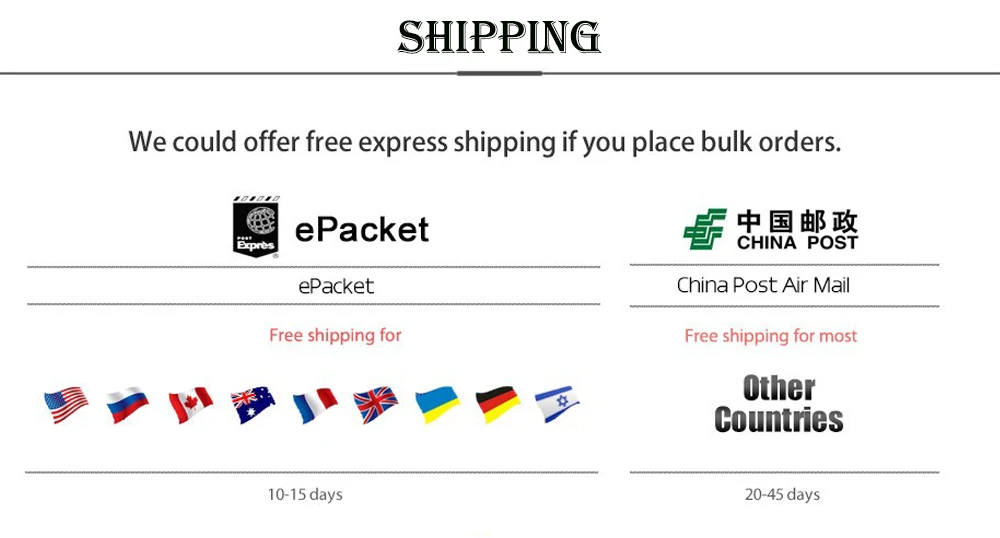 1) We ship worldwide by DHL, UPS, Fedex, TNT, EMS, E-packet, China Post, and Singapore Post and so on.